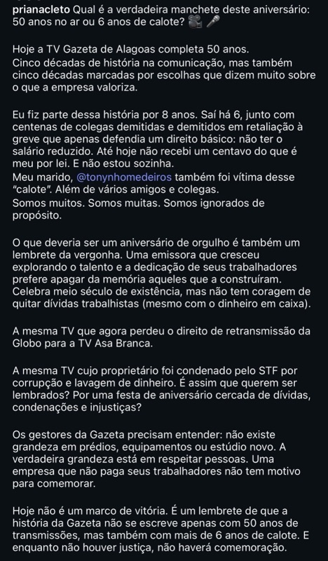 O que se registra aqui não é recalque, é a preocupação legítima com quem está vivendo, na pele, uma das páginas mais duras da história da TV em Alagoas.